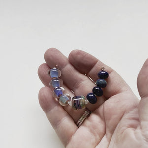 Four beads measure approximately 10mm in a deep, rich purple with grey-blue undertones. Four beads measure approximately 12mm in a soft, creamy purple. The set is finished with one 12mm barrel-shaped bead in a pinkish purple tone.  The barrel bead was made using a 1/16mm mandrel and the smaller beads have a 1mm hole.