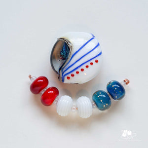 This striking set features a bold focal bead in red, white, and blue with a window of shimmering blue dichroic glass at its center.