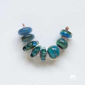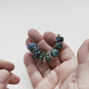 This sample set features a variety of silver enhanced glass beads created while exploring different glass reactions and forms.