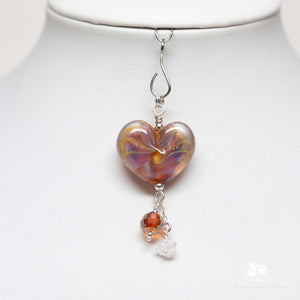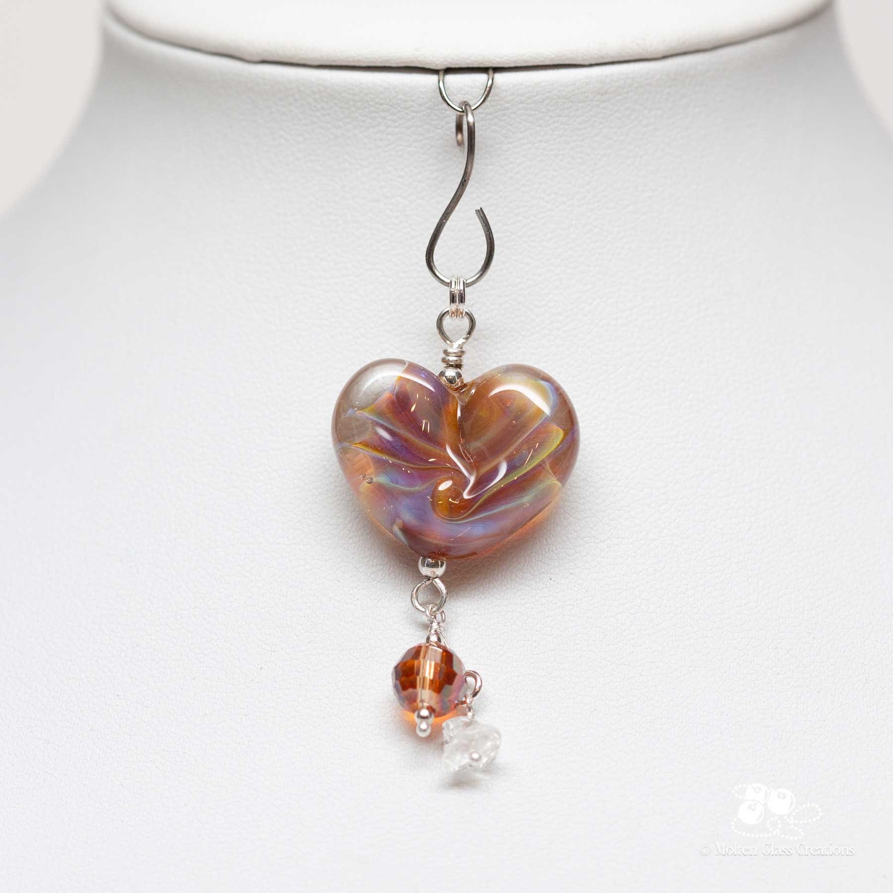 The heart is shaped by hand at the torch and finished with sterling silver wire and findings. A large round crystal and small clear glass chips add gentle movement and subtle sparkle, complementing the tones within the glass. Lightweight and comfortable, this pendant works well worn on its own or layered with other favourites.