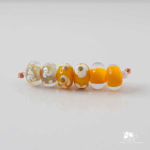 Bright, cheerful, and full of movement — this set of six handmade beads features soft variations of yellow, from golden honey to pale lemon. Four of the beads are decorated with playful white pinwheel swirls, adding a touch of whimsy to the sunny palette.