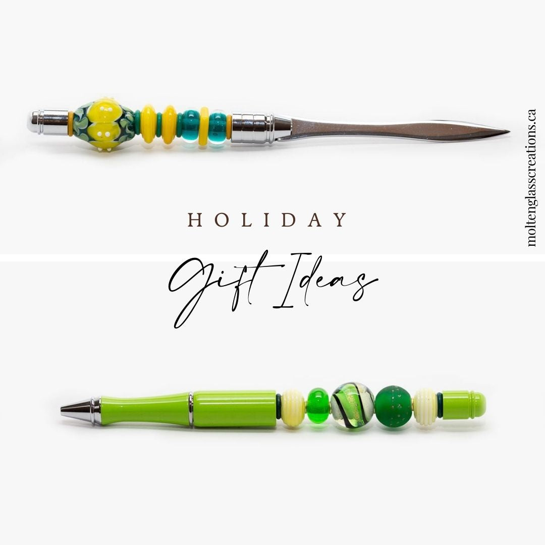 Decorative, modern letter openers, pens, and seam rippers laced with gorgeous glass beads perfect for on-the-fly inspiration.