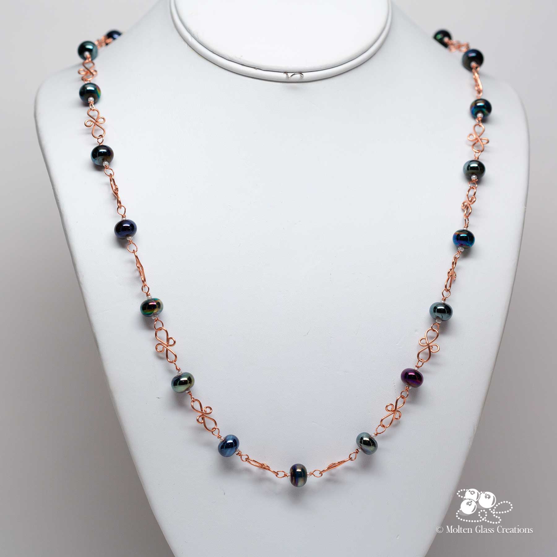 The copper links are shaped one at a time, including the clasp, creating a warm, earthy structure that frames the glass without overpowering it. The contrast between the smooth, reflective beads and the hand formed copper gives the piece a distinctive, crafted feel.