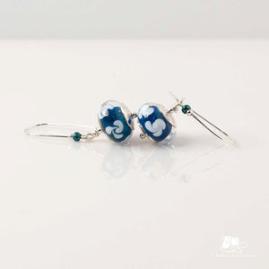Bring a splash of bold elegance to your look with these deep blue glass bead earrings. Each earring features a 13mm handmade lampwork glass bead in a rich, ocean-deep blue, accented with delicate white pinwheels. This pair is one-of-a-kind, with subtle variations in hue and pattern that make them uniquely yours.