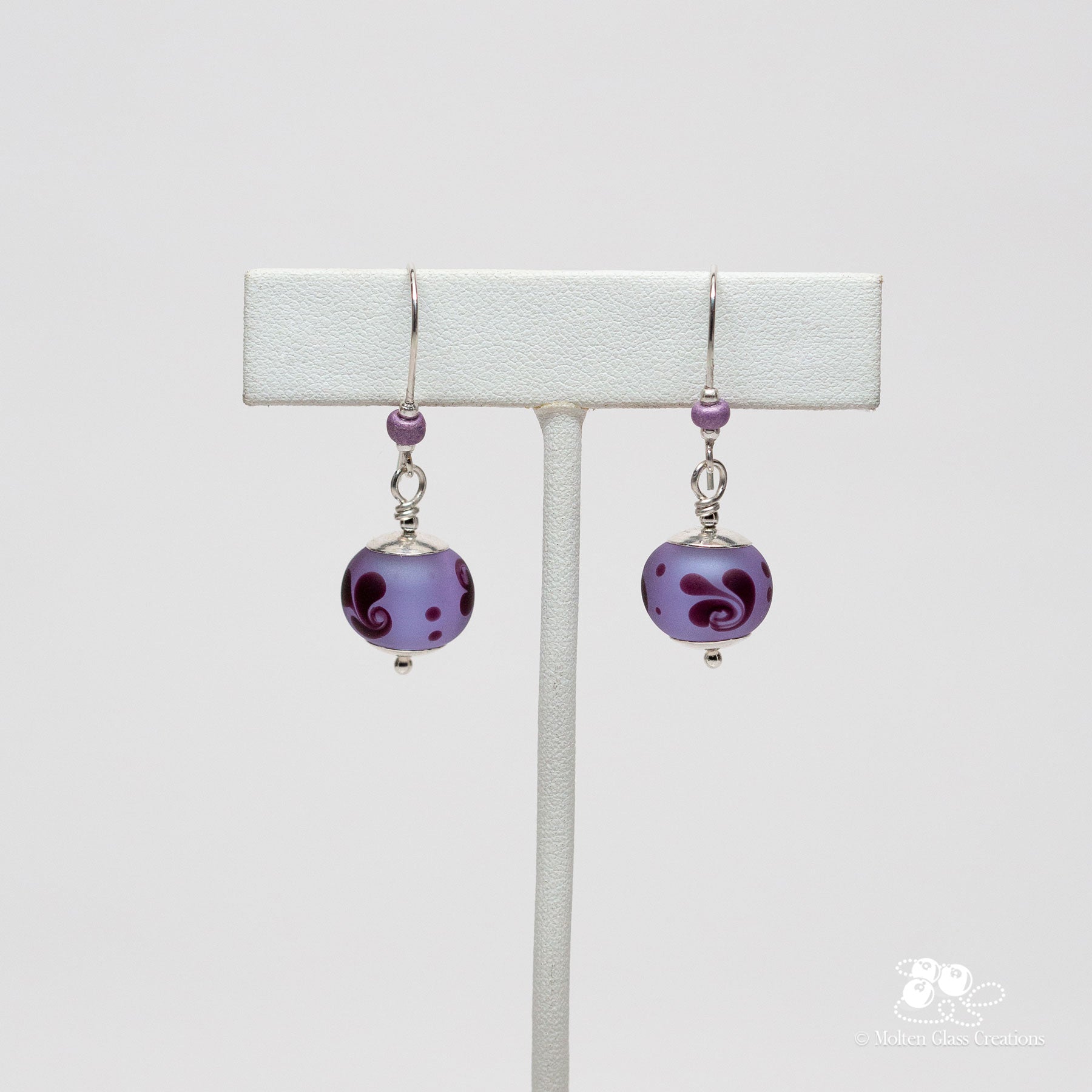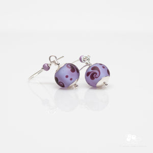 Soft, serene, and full of handmade charm, these earrings feature 15mm pale lavender glass beads etched to a smooth matte finish and decorated with gentle pinwheel swirls.