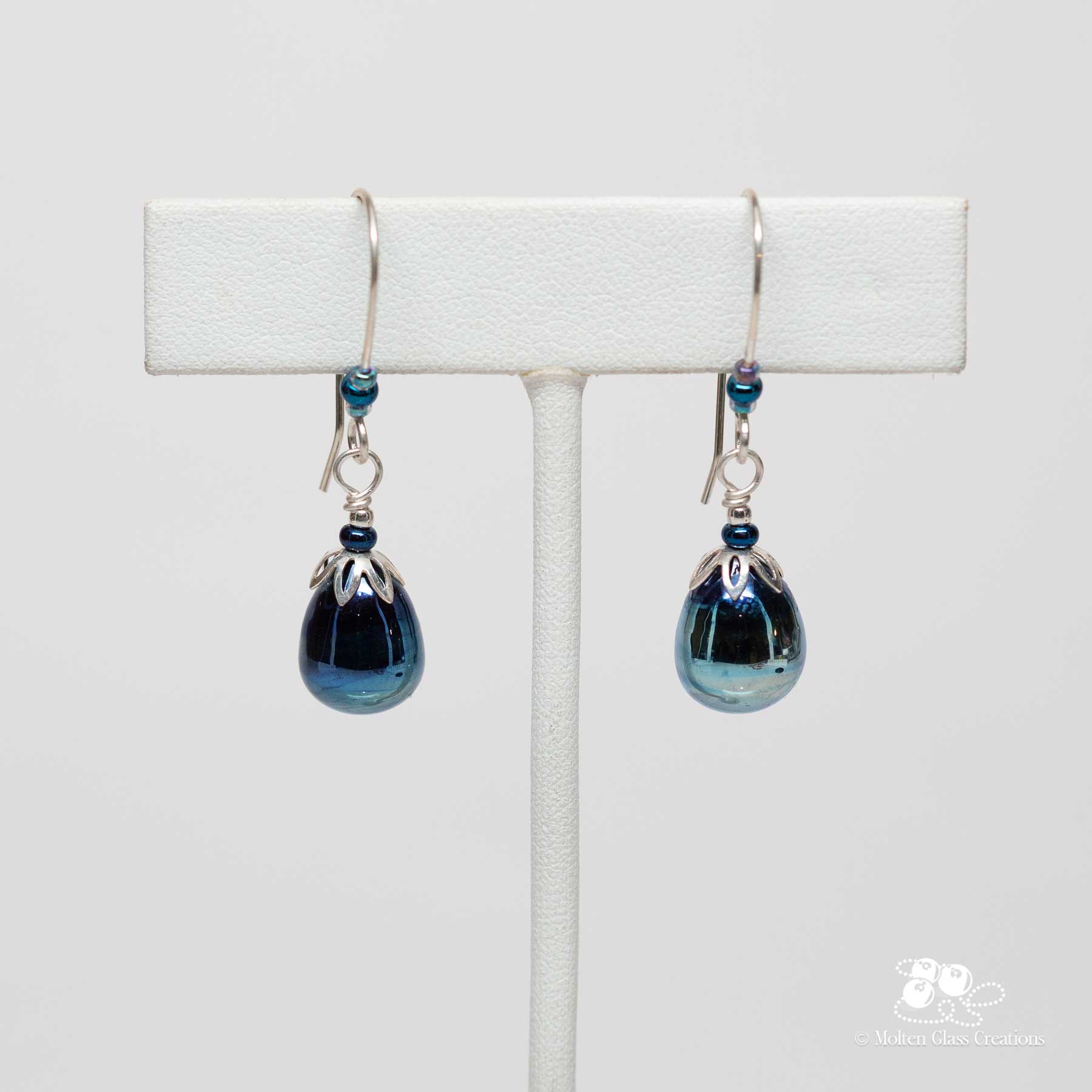 These earrings feature handmade teardrop beads created from reactive glass that develops a natural metallic blue sheen in the flame. The colour shifts gently across each bead, giving the pair a smooth, reflective finish with quiet depth. Decorative sterling silver caps frame the tops of the teardrops, and small coordinating glass beads complete the design.