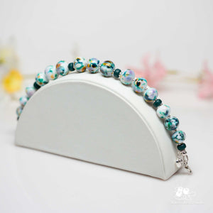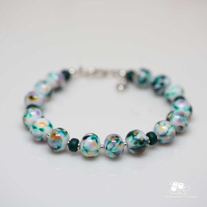 Fifteen 11mm glass beads are layered over a white base, with deep green, touches of lavender, and hints of amber creating a painterly, meadow-like effect. Each bead has its own little blend of colour, coming together in a way that feels organic and balanced rather than perfectly matched.